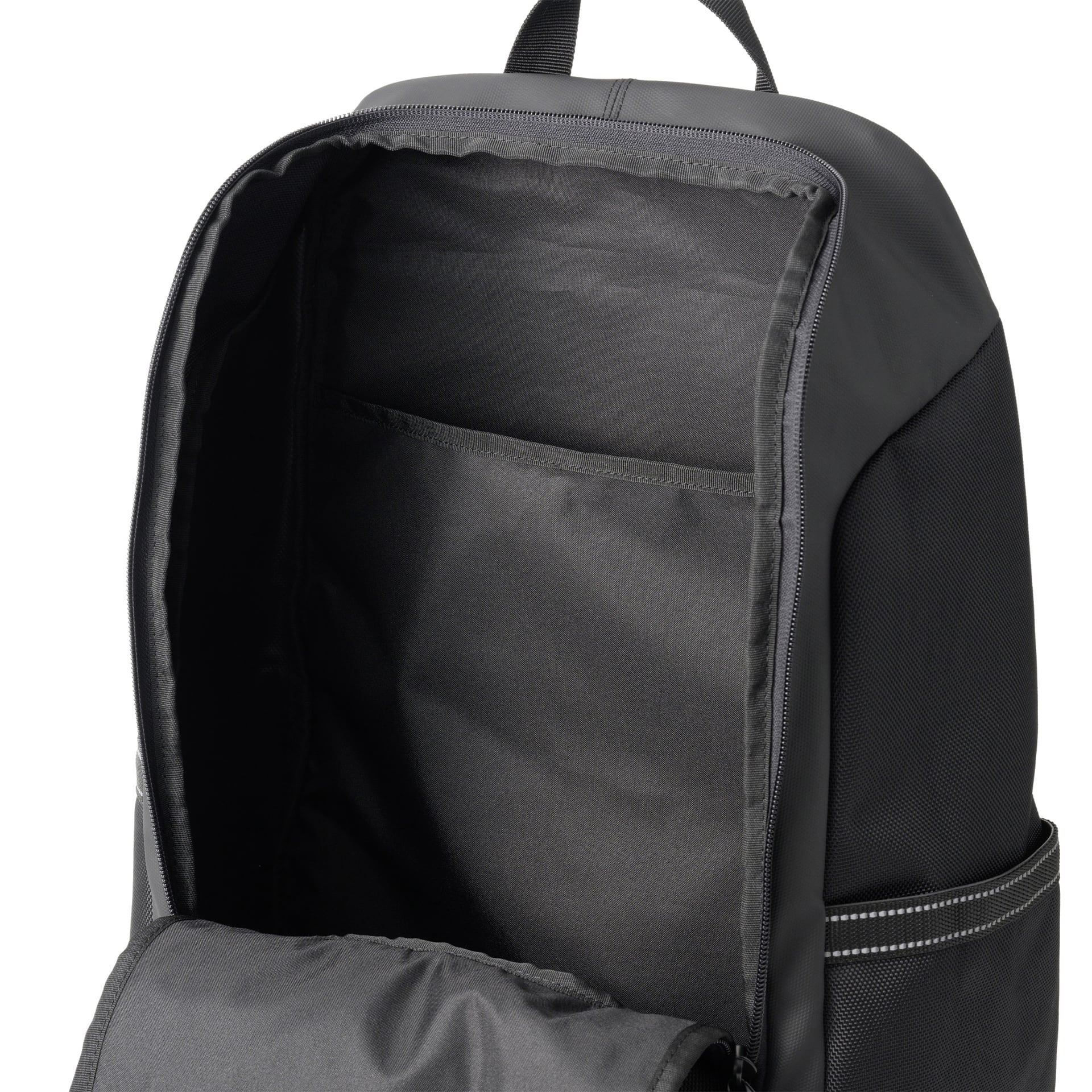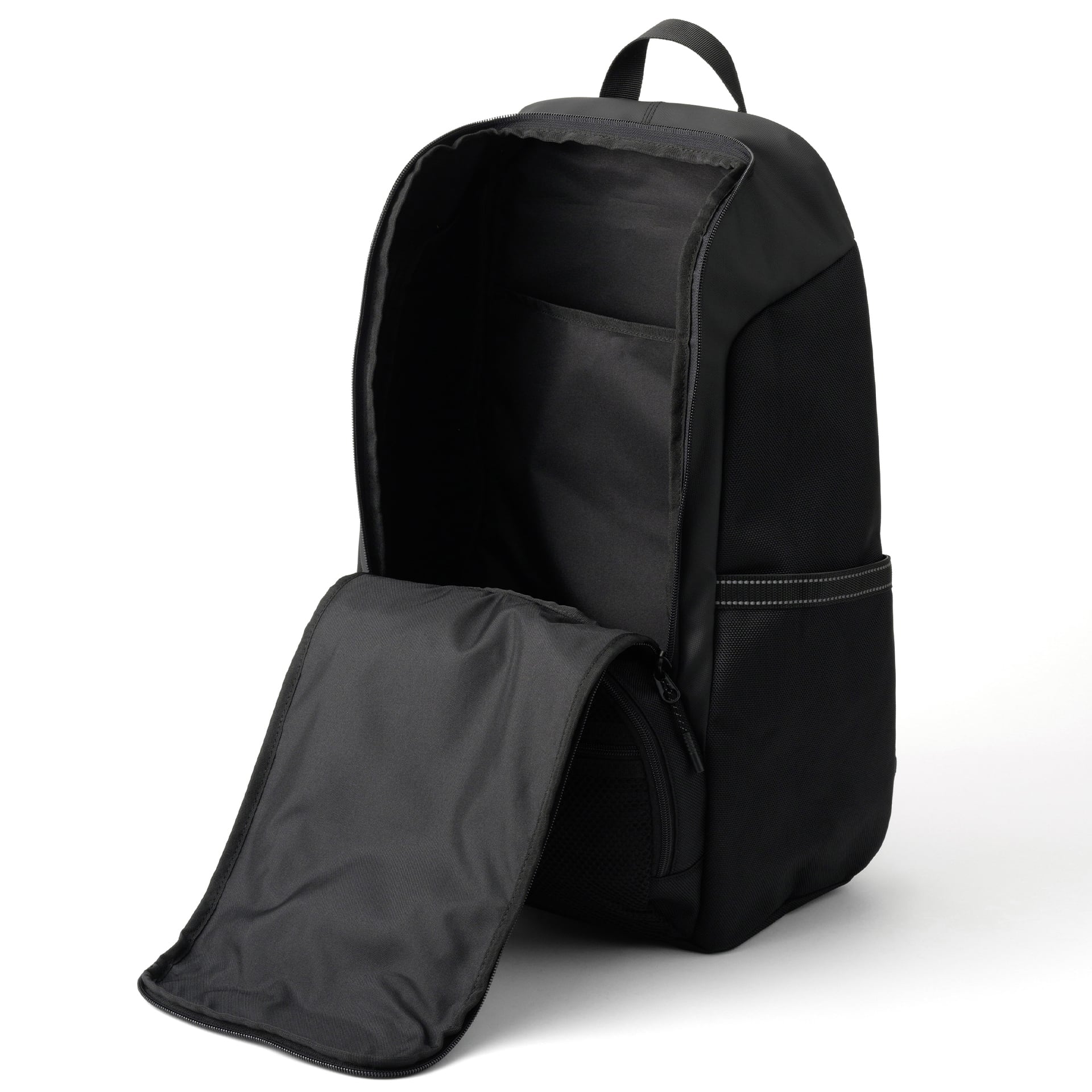 メインコンパートメントは、厚手の柔術着もストレスなく出し入れできる両開きファスナーを採用。内部にはA4サイズの書類が入るポケットを完備し、練習ノートや着替え等を効率よくセパレート。開閉蓋のファスナーポケットは小物の定位置として機能し、両サイドのポケットはシェイカーやウォーターボトル、折りたたみ傘の収納に最適なサイズで設計されています。